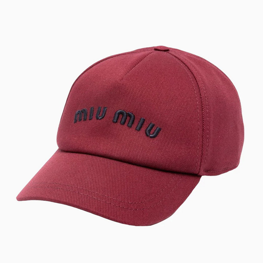 Miu Miu bordeaux-red cotton cap. Crafted in a twill weave with a curved peak and a five-apnel construction.
